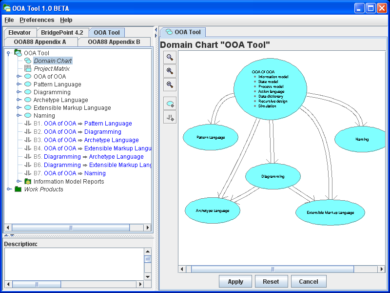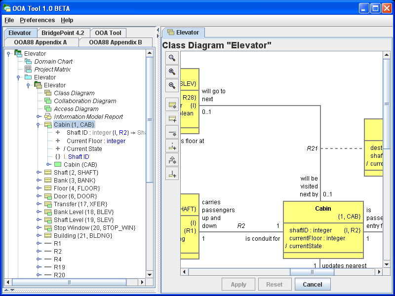 OOA Tool is a Shlaer-Mellor OOA/RD CASE tool with Executable UML support implemented in 100% pure Java™ which includes a model editor and will include a simulator and translator. It is currently being developed in parallel with OOA10. Once development finishes, a Professional edition will be released at a competitive price, while a Standard edition will be distributed at no cost indefinitely. In the meantime, an early access Beta release is available for download.